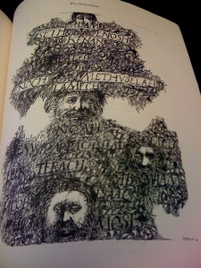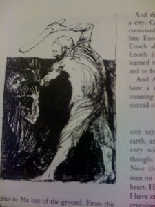It’s no surprise, given her Bible translation philosophy and practice, that Lore Segal teamed up with illustrator Leonard Baskin for The Book of Adam to Moses. His illustrations for the work are not just mysterious and brooding and wonderful, as the New York Times reviewer observed; but they are also for the most part drawings of faces, human and sometimes divine, and are always untitled. Segal makes no effort to give captions for the illustrations either. (As you can see, below, the book sections at the top of the pages give the only clue as to what the drawing might be some sort of specified reference for.)