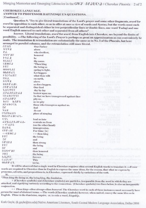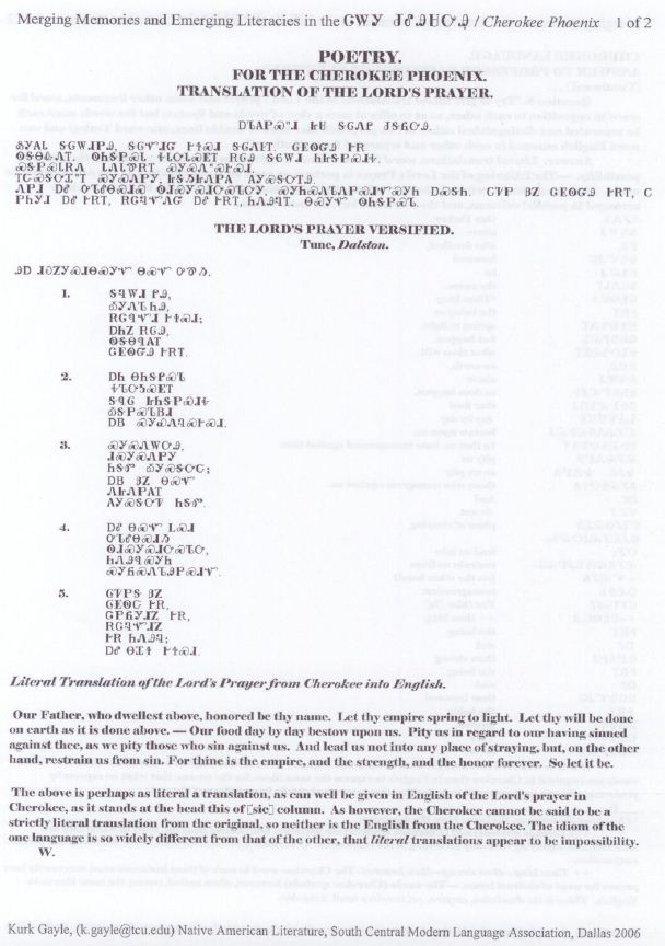 Now that “Lord’s Prayer” from the Greek to the Cherokee to the English. I’ve reproduced it as it appeared in the paper Cherokee Phoenix (ᏣᎳᎩ ᏧᎴᎯᏌᏅᎯ, Tsalagi Tsulehisanvhi) and what you see is from a handout I made once for a conference paper. I do hope you’ll be able to make it big enough to read it:
