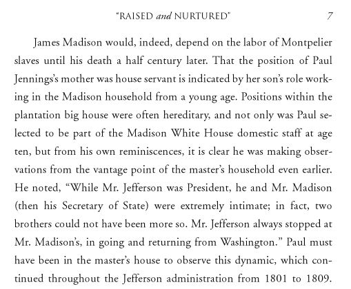 As you can see on this cover of the book, A Slave in the White House: Paul Jennings and the Madisons, Paul Jennings was not ever an African-American although he is a man, and he is black. He was a slave of the family of a white man, the American President James Madison. In this book, as Elizabeth Dowling Taylor quotes him (on page 7), Jennings speaks of encountering both Madison and Jefferson in close quarters together. Did they so notice him? Here’s how Dowling Taylor recounts it: