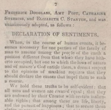 Thus, one of the earliest appropriations of the Declaration of Independence was by women and by men, white and black. Well, it wasn’t that early in American history. It was in 1848 that a few women drafted The Declaration of Sentiments, fashioned after Jefferson’s declaration, and a few women and men signed it. They wrote that “all men and women are created equal,” and four of them were Frederick Douglass, Amy Post, Catharine Sebbins, and Elizabeth Cady Stanton. Here’s from a page from the USA Library of Congress: