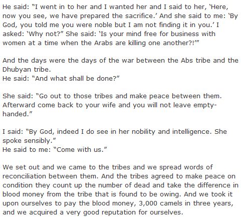 The story translated below is part of the information Isfahani offers about the acclaimed pre-Islamic poet Zuhair bin Abi Sulma. One of the latter’s most beautiful and best-known poems – and indeed one of the most famous exemplars of the early Arabic qasida (metrical ode ) – praises the generosity of Harith bin ‘Auf and Harim bin Sinan of the Bani Dhubyan tribe. The two undertook to pay a large sum of blood money as compensation for the deaths of members of a rival tribe, thereby putting an end to a bloody war of four years, which had originally broken out between the two tribes because of a horse race.