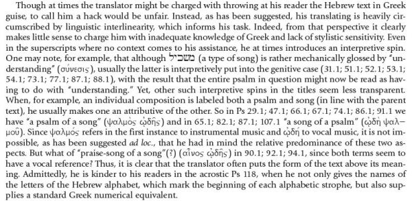 Not all readers of the Septuagintal psalters hold it in such esteem. Mitchell Dahood (Pontifical Bible Institute) Anchor Bible Psalm trilogy is one of my go-to commentaries, and Dahood seems to take a dim view of the Septuagintal psalters.