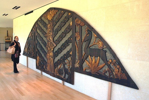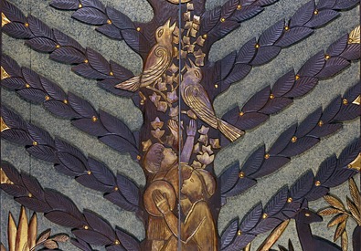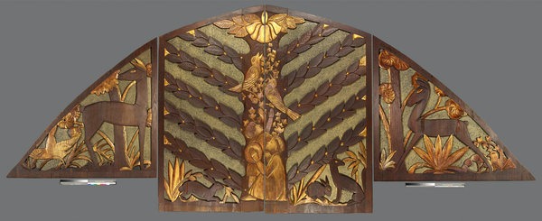 In 1937, under the auspices of the W.P.A., Johnson designed two large Art Deco redwood reliefs, one of which depicted an idealized natural world of gilded gazelles, open-beaked birds, spiky-leafed plants and a boy clapping cymbals.
