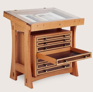Tools and Materials: This selection of tools and materials used by the scribes and illuminators includes hand-carved stamps, antique inks and powdered pigments, a mortar and pestle, quills and brushes, penknives, packets of gold leaf squares, a gilder’s cushion and gilder’s knife, burnishers, practice samples of vellum, and an antique drafting set.