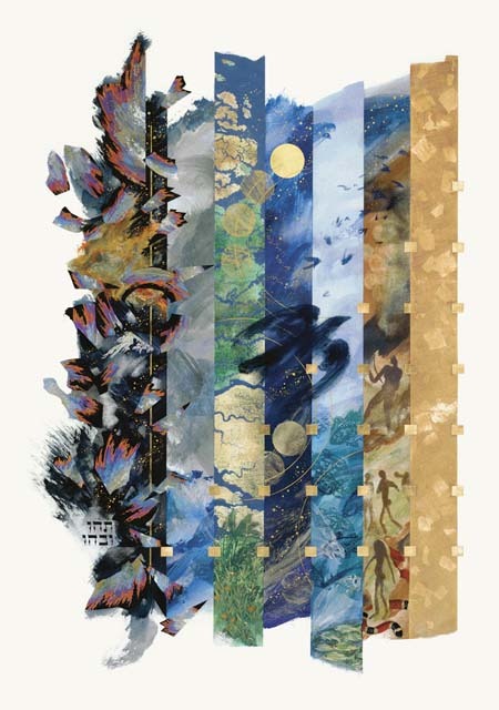 Creation: The structure of this illumination reflects the seven-day progression of the Bible’s Creation story, with seven vertical strips, one for each day. On the first day, fragmented shapes explode from the primordial void, expressed by the Hebrew words “tohu wabohu” (chaos). A vertical gold line marks the moment in the story when God ordered, “Let there be light.” Day three contains satellite pictures of the Nile Delta, suggesting the division of land and water and the beginnings of vegetation. The creation of human beings on the sixth day is represented by images from aboriginal rock paintings in Africa and Australia. The snake implies dangers to come, in the Garden of Eden. The golden seventh day is given over entirely to the contemplation of the spirit. The raven flying across the composition is the traditional carrier of God’s message to Saint Benedict.