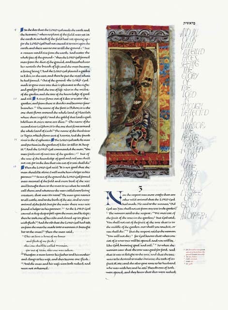 Adam and Eve: Adam and Eve are presented as an African man and woman surrounded by patterned fabrics from various ancient cultures. Photographs of Ethiopian tribes-people influenced Jackson’s design. He wanted to link the notion of the Bible’s first man and woman with current archaeological and anthropological theories that humankind originated in Africa. The decorative framing around Adam and Eve includes African tapestry patterns and, on the right, a Peruvian feather cape. The horizontal stripes are details of Middle Eastern textiles and of white body painting on black skin. The poisonous coral snake, also depicted in the Creation and Garden of Eden illuminations, appears between Adam and Eve. Jackson’s use of a gold bar framing Adam and Eve is meant to suggest God’s presence as a framework for human life.