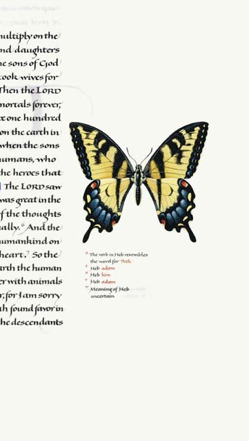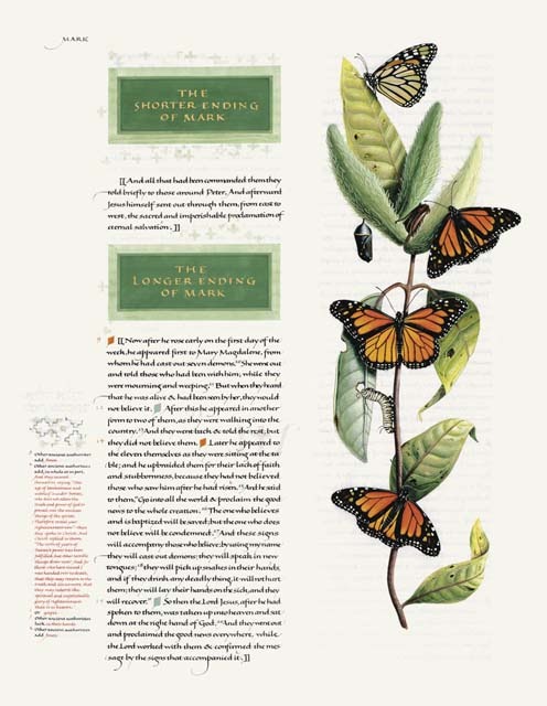Monarch Butterflies: The margins of medieval Bibles were often decorated with plants and animals that had symbolic meanings. In Christian art the butterfly symbolizes resurrection. The three stages of its life–caterpillar, chrysalis, and butterfly– correspond to life, death, and resurrection. In The Saint John’s Bible, all the species of flora and fauna depicted in the margins are native to the Minnesota woods surrounding Saint John’s University or to the Welsh countryside near Donald Jackson’s home. Chris Tomlin, a specialist in botanical and nature illustration, came to Minnesota to research subjects for marginalia, and these monarch butterflies help root this Bible in the community of Saint John’s Abbey and University in Minnesota.