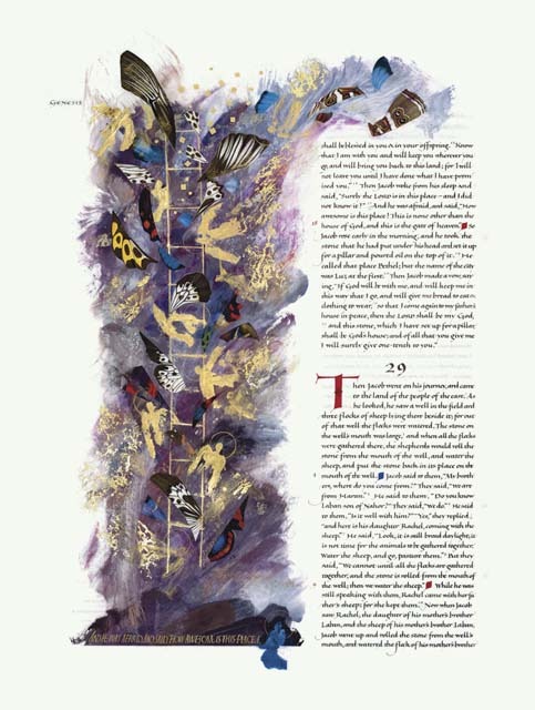 Jacob’s Ladder: This image evokes the surreal wonder of Jacob’s dream about angels ascending and descending a ladder that reached from earth to heaven. According to the Bible, in that moment when heaven and earth were briefly joined, Jacob realized his special relationship with God. Accompanying the abstract gold angels are fragments of realistic butterfly wings. They echo the angels’ wings, becoming an earthly analogy for angels and also a metaphor for the fleeting nature of Jacob’s vision. The butterflies appear against a lacy pattern of gold, a gossamer presence. The quotation along the bottom, which can be linked with words from the preceding verse — “Surely God is in this place” — refers to Jacob’s powerful and moving experience.