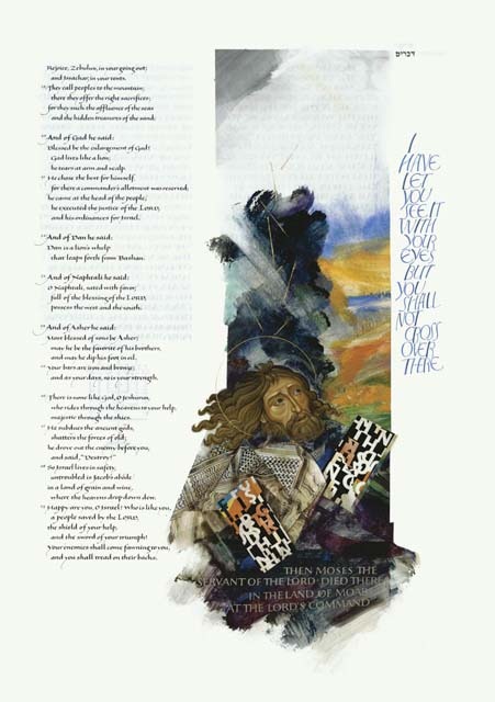 Moses is shown with fragments of the tablets of the Ten Commandments and a prayer shawl patterned after a traditional Middle Eastern design. Mount Nebo is depicted in the background. According to the Bible, God led Moses to the top of Mount Nebo, from where he could see the Promised Land. However, Moses was not allowed to enter the Promised Land because of a momentary lack of trust in God. He died on the mountain.