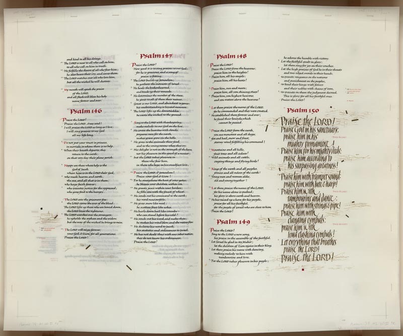 Graphics Layout: On a computer, the project’s graphic designer/typesetter devises the precise layout of every page. This allows the scribes to work simultaneously, since they know in advance exactly how each page will begin and end. Using a typeface that closely approximates the script Jackson designed for the Bible, the graphic designer/typesetter determines the space for each letter based on raw digital text of the New Revised Standard Version, which follows prescribed guidelines. Paragraphing and spacing between paragraphs are integral parts of the translation, and a special dictionary establishes acceptable word breaks. Printouts are created to be used by the scribes, illuminators, and proofreaders.