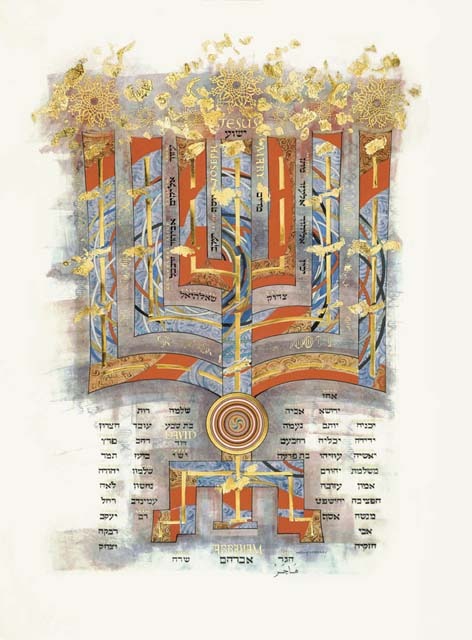 Matthew Frontispiece: The Gospel of Matthew begins with the genealogy of Christ. Reaching back into the Old Testament scriptures to Abraham, progenitor of the Hebrew nation, Matthew lists the names of succeeding generations, culminating in the birth of Christ. This illumination is a family tree structured as both a tree of life and a menorah, the Jewish seven-branched candelabra. Placed at the beginning of the first gospel, the menorah serves as a bridge between the Old and New Testaments. A mandala-like cosmic image near the base is common to several religions and implies the universality of the search for a supreme being. The intricate gold medallions above the menorah were inspired by illuminations from the Koran. Reflecting our own time, patterns of DNA double helixes between the outer branches emphasize the connectedness of all humanity. The ancestral names flank the base of the menorah/tree and climb between the innermost branches. Abraham’s name appears in English and Hebrew, with that of his wife, Sarah, from whom these generations arose. Named in both Arabic and English is Hagar, Sarah’s handmaiden, with whom Abraham fathered Ishmael, the ancestor of the prophet Muhammad, founder of Islam. At the very top is the name of Jesus, in the same lettering style as Abraham, David, Mary, and Joseph.
