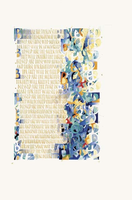 Beatitudes: The letters of the word “blessed” are scattered randomly in a multicolored pattern, here and there reuniting to form the word. The overall effect recalls mosaic decoration, a traditional artistic medium dating to pre-classical times in the Near East.