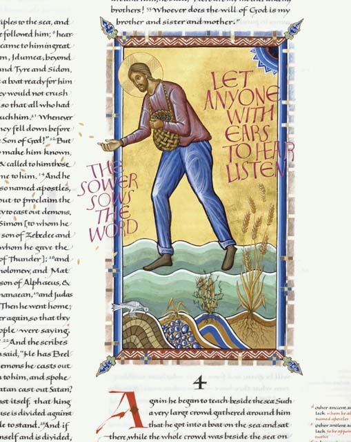 A few years ago my family and I saw the Dead Sea Scrolls exhibit when it was in San Diego. At the end of the DSS displays, there were some printed bibles from the Renaissance era, and a couple of pages from the original St John’s bible, including one of the iconic pieces by Aidan Hart. What splendor, all of it, but I had already begun collecting the mass-produced volumes of the SJB, and to see some of the original was a quite unexpected, awe-inspiring blessing.