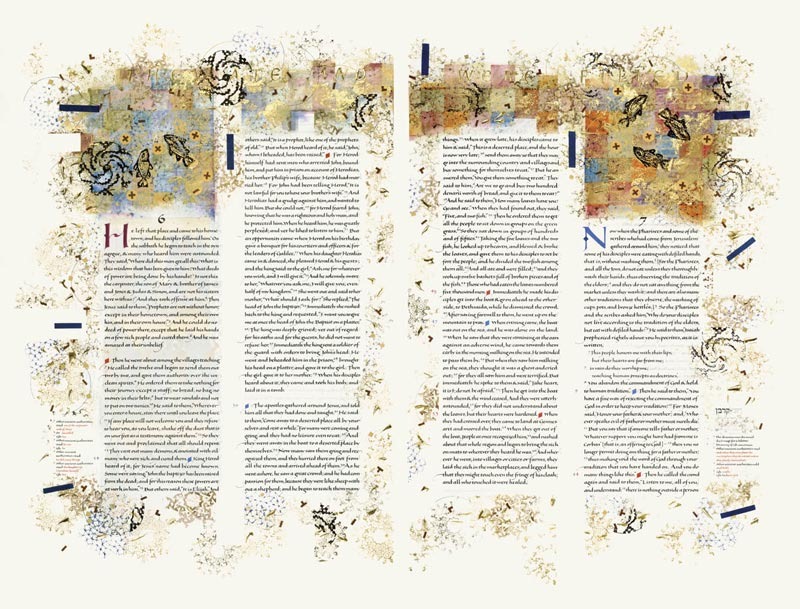 The Multiplication of the Loaves and Fishes (Mark 6:30-44, 8:1-10): In the Gospel of Mark he narrates twice the story of Christ providing food for multitudes of people, probably giving two versions of the same event. This illumination accompanies the first version, in which Christ miraculously multiplied five loaves and two fishes to feed five thousand people, with twelve baskets of leftovers. Tradition locates this event at Tabgha, on the west side of the Sea of Galilee. In this image, the stamped images of fish derive from a mosaic in Tabgha and the circular loaves, marked with a cross, prefigure the bread of the Eucharist (Communion). The baskets (shown partially) have geometric designs based on ancient Native American Anasazi basketry, acknowledging the American origin of this Bible and the coexistence of other beliefs.