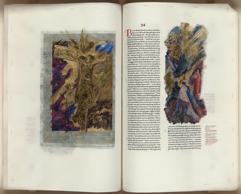 The Crucifixion (Luke 23:44-49): Rendered in raised and burnished gold, the crucified figure of Christ dominates this composition. Luke’s Gospel recounts that upon Christ’s death darkness covered the earth for three hours, indicated here by the night sky, and that the curtain of the temple, shown as shreds of purple, was torn in two. The contrast of pain with the glory of gold relates this image to current theological discussions concerning the meaning of the Crucifixion in the contemporary world. The delicate gray border was printed with English lace, contributing to the recurring theme of textiles in The Saint John’s Bible illuminations.