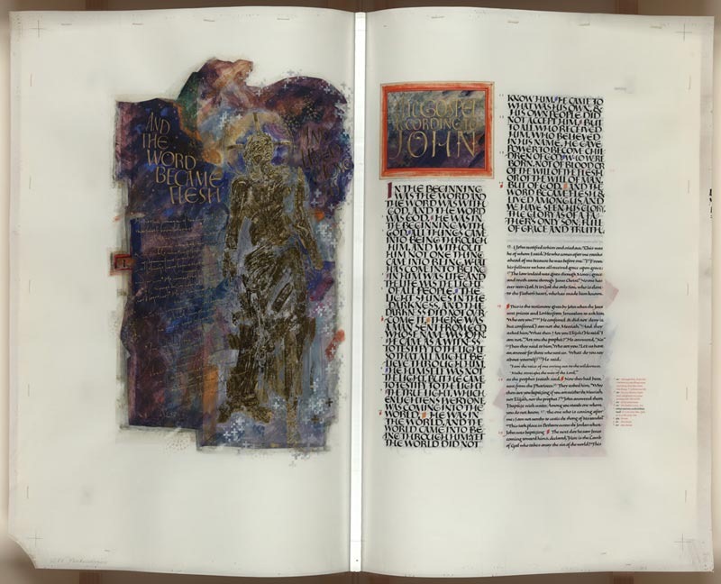 John Frontispiece: The Word Made Flesh (John 1:1-14): Stepping out of darkness, which alludes to the chaos that precedes Creation in the Bible, the golden figure of Christ brings light and order. Words in golden script, from Colossians 1:15-20, link the figure of Christ with the words “And lived among us” at the upper right. A keyhole jutting into the left margin recalls the tradition of locked and hinged manuscripts in securing, protecting, and holding the “key” to the Word of God.