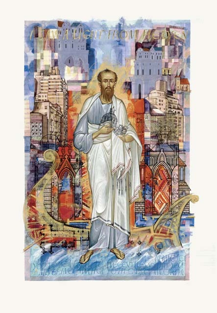 The Life of Paul (Acts): Paul was the apostle to the Gentiles, and he traveled as a missionary throughout the Near East. He is posed here in the manner of classical Greek statues. A prayer shawl draped over his shoulders indicates his upbringing as a devout Jew. Surrounding him are secular and sacred buildings from nearly every historical period of the last two thousand years. Because he made several sea voyages and was once shipwrecked, Paul stands before a Greco-Roman sailing vessel. An energetic church builder, he holds a model of a church that recalls Saint Peter’s Basilica in Rome, the city where he was martyred under the emperor Nero. The words at the top, “I saw a light from heaven” (26:13), refer to Paul’s conversion to Christianity. Those across the bottom proclaim his divine mission: “The Lord has commanded us, saying, ‘I have set you to be a light for the Gentiles, so that you may bring salvation to the ends of the earth’ ” (13:47).