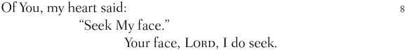 24 tc Heb “concerning you my heart says, ‘Seek my face.’” The verb form “seek” is plural, but this makes no sense here, for the psalmist is addressed. The verb should be emended to a singular form. The first person pronominal suffix on “face” also makes little sense, unless it is the voice of the Lord he hears. His “heart” is viewed as speaking, however, so it is better to emend the form to פָּנָיו (panayv, “his face”).