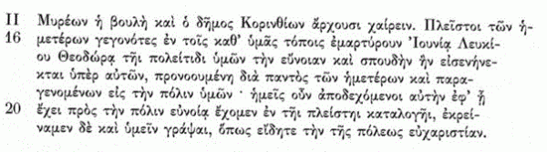 The Council and people of Myra to the rulers of Corinth, greetings. Many of ours being in your territories testify to Junia Theodora, daughter of Lucius, citizen of yours, for the goodwill and effort that she made on their behalf, occupying herself continually on behalf of ours, at the time of their arrival in your city. According her our approval for her goodwill to the city, we hold her in the greatest esteem, and have decided to write to you in order that you may know of the gratitude of the city.