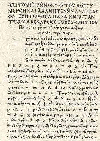 This is the first page of the first European printed Greek grammar and as such is a fundamental text of both the Renaissance and the Reformation. This page is from the 1476 edition printed in Milan. The author, Constantine Lascaris came to Italy after the fall of Constantinople and became a teacher of Greek. He wrote this grammar for his student, the young Ippolita Szforza. Ippolita later married the son of Ferdinand I and became a patron of humanist scholars, but died young at the age of 38.