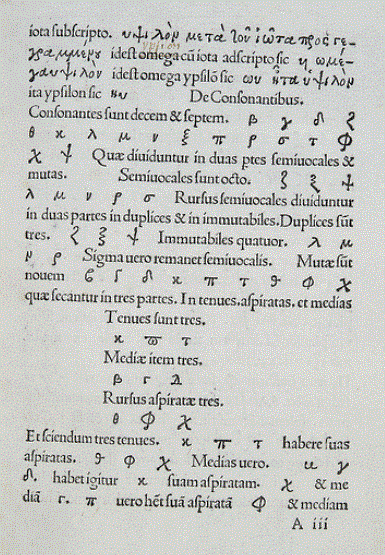 This is the first book printed in Greek and so determines the style of font. The first Greek fonts involved ligatures, abbreviations, and variant forms of the same letter. The font was created in order to imitate manuscript Greek handwriting.