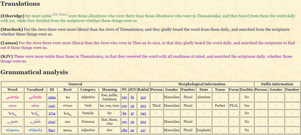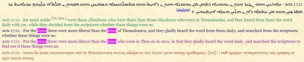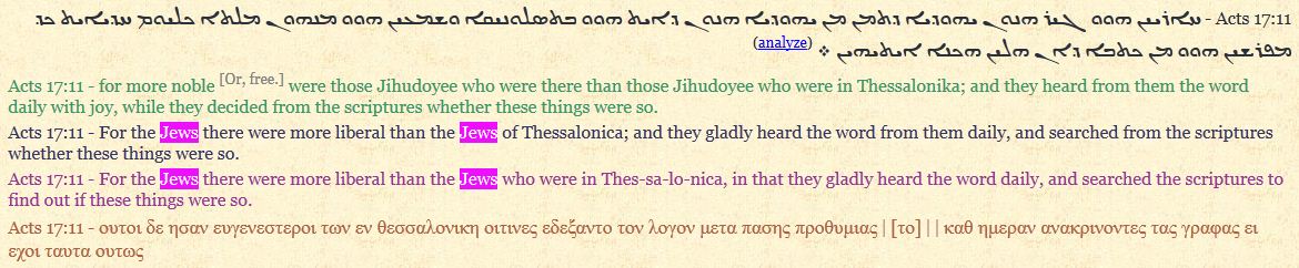 What the Aramaic spells out much more than the Greek, from the Greek, is that the Bereans and the Thessalonians were all the Jews. “Some Jews” were “more liberal” than others in reading the Scriptures of the Jews, i.e., the Hebrew Bible and/ or its translation into Greek, outside of Jerusalem before 70 CE. Paul is one of “the Jews.” The book of Acts, then and there, is largely about various ones of “the Jews.” This particular passage is about the necessary Jewishness of the Bible, the Jewishnesses of its readings, of all sorts.