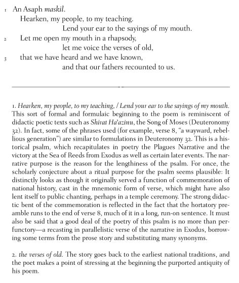 The clear allusions to Exodus and Deuteronomy in the Psalm and in Alter’s footnote make rather obvious that the “teaching” in verse 1, right at the start, is “Torah.” Verse 30 of Psalm 78 bases its language on Numbers 11, verses 20 and 33, says Alter. And verse 13 of the Psalm, Alter observes, “is a direct quotation [of the Hebrew] from the Song of the Sea, Exodus 15:8.” So more than just a study of Torah, this Psalm seems to be a study of the Hebrew language of Torah and a bit post-Biblical borrowing of Torah.