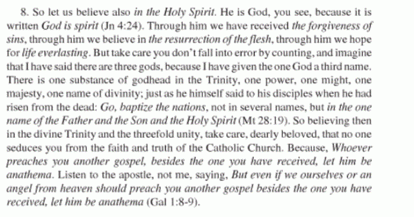 The phrase una potesta, “one power” and by definition in English, “one authority over” is recurring throughout the centuries, and, of course, has its origin in Augustine, – his sermon 215, to be exact, an exposition on the creed. Here is section 8.