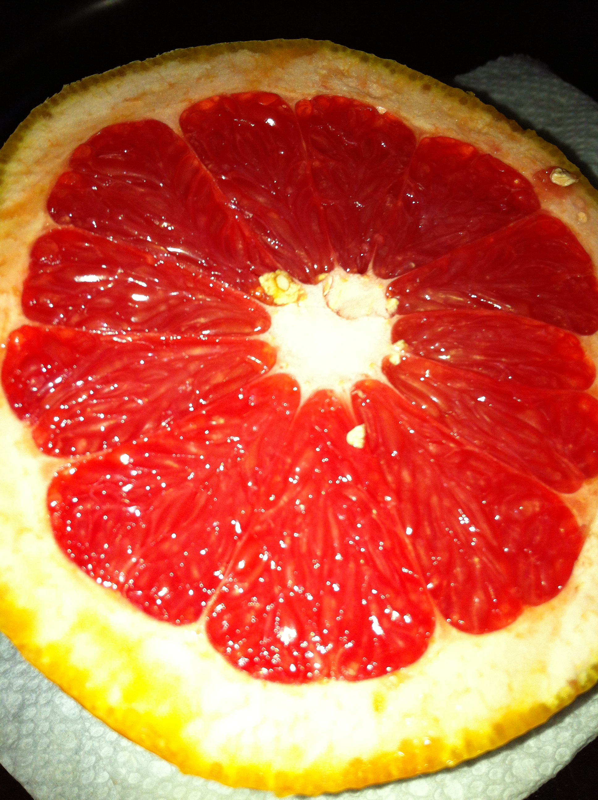 I do want to show you now what I had early this morning for breakfast. Here in Texas it’s a Texas ruby red grapefruit.