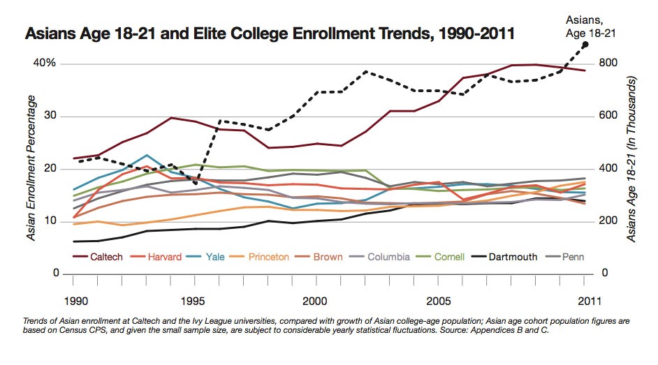 This study gives some fairly impressive statistical claims that the Ivy League schools have imposed a de facto quota on Asian-American undergraduates.