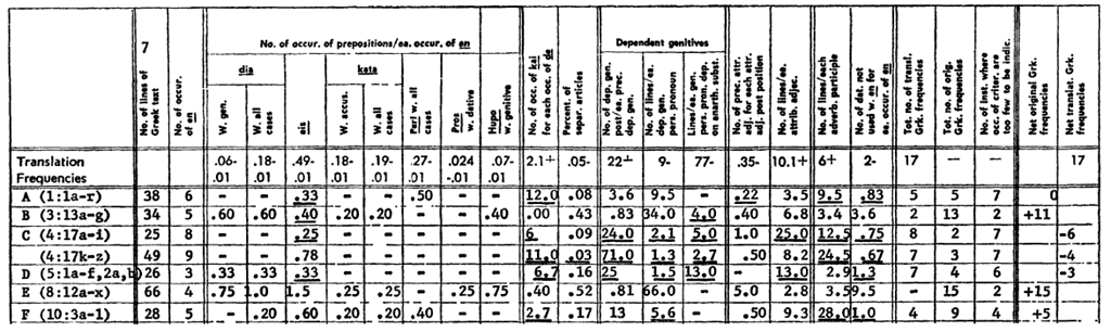 [T]he net number of translation-Greek or original-Greek frequencies was most significant. These net figures are arrived at as follows: Whenever a section has more occurrences of original-Greek frequencies than occurrences of translation-Greek frequencies, the number of occurrences of translation-Greek frequencies was subtracted from the number of occurrences of original-Greek frequencies, and the resulting number is the net occurrences of original-Greek frequencies.