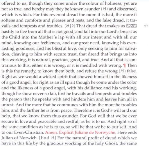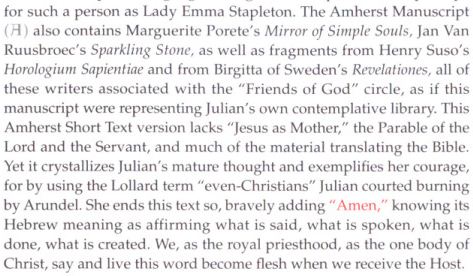 In the end, when we look at how Holloway brings in various manuscripts of Julian of Norwich’s Showings of Love, we must appreciate how she brings to the fore hidden layers of meanings. It’s a composite translation, yes. And it’s also, furthermore, a look at and a listen to the Hebrew lost at certain points and stages of Julian’s writing and revising. So let me close this post just by showing once again Holloway’s and then Julian’s “amen.”