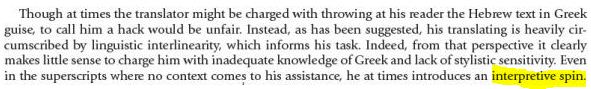 In this case, however, it seems that Alter finds nothing useful in the Greek rendering of the Hebrew. His note points to other issues: