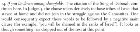 In Genesis 49.14, the LXX does actually make some sense, perhaps picturing the tribal allotment of Issachar in the midst of the other tribes. The Hebrew of Gen 49.14 does not make much sense at all: “Issachar is a strong donkey, lying down between the sheepfolds;” (NRSV) Here, “sheepfolds” is used only because of Judges 5.16 and Ps 68.14. (I.e, we have reached total circularity! The NRSV’s “sheepfolds” is also used by NASB, ESV, NIV, TNIV, JPS. The KJV, Holman, NET, and NLT use the “saddlebags” idea.)