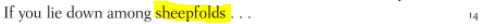 “Kings of hosts flee, they flee; and she that dwells within the home apportions the booty. Were you to lie within your boundaries, wings of the dove covered with silver and her pinions with the shimmer of gold.