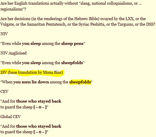 Also, the ISV translators supposedly use the LXX Greek among various resources. So here is what I noticed, when comparing what Bias has done for the ISV with what other version translators have done (who don’t necessarily use the LXX as a source and who do often translate with English regionalisms). I’m just comparing the very first part of verse 14 (or 13, depending on the numbering system):