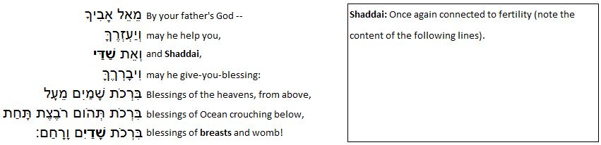 In Genesis, El Shaddai is the God of Abraham and Isaac and Jacob. In Genesis 49:25, Shaddai, – שַׁדַּי the Almighty, is the one who blesses with the blessings of the heavens and the deep and the breasts שָׁדַיִם (the shadayim) and the womb.