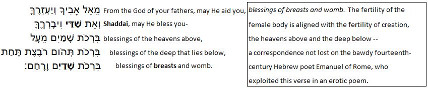 And so: that the only instance of שָׁדַיִם in the Tanakh occurs here with μαστῶν (which is the only instance of this Greek phrase in the LXX Pentateuch) is rather striking, to me anyway. My co-blogger Suzanne talks also about the “euphonic and associative connections” (which gets to and lets in the Greek phrasings). And still: what is considerably startling to the reader (and maybe the listener of Hebrew too) is how שַׁדַּי (not the only name of God in this short context) so sounds like the plural שָׁדַיִם. The LXX translators lose that with perhaps their equivalent to השם, HaShem, the unspeakable “Name.”