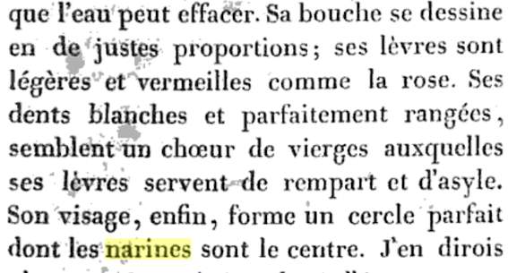 Her mouth is drawn in exact proportion, her lips are light and vermilion like a rose. Her white and perfectly straight teeth look like a choir of virgins around which the lips serve as rampart and refuge. Her face, enfin, forms a perfect circle in which her nostrils are the centre.
