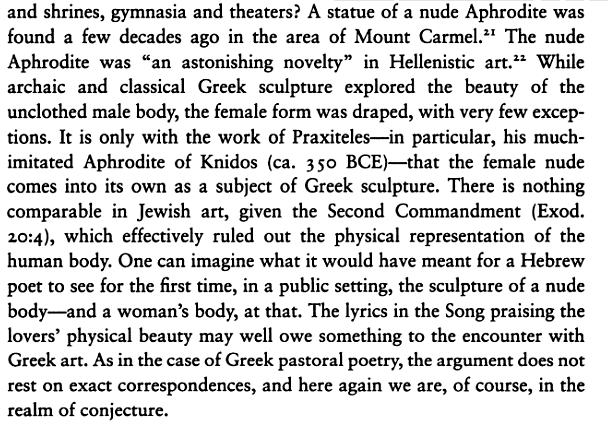 Now that linguistic data has suggested that the Song of Solomon was written in the 3rd century BC, some are looking closer at its structure as a wedding song, in the same genre as Sappho’s songs, and wondering if there was an influence. Here is a thought provoking post, and I suggest a look at this book which is online also. On page 26, there is this speculation,