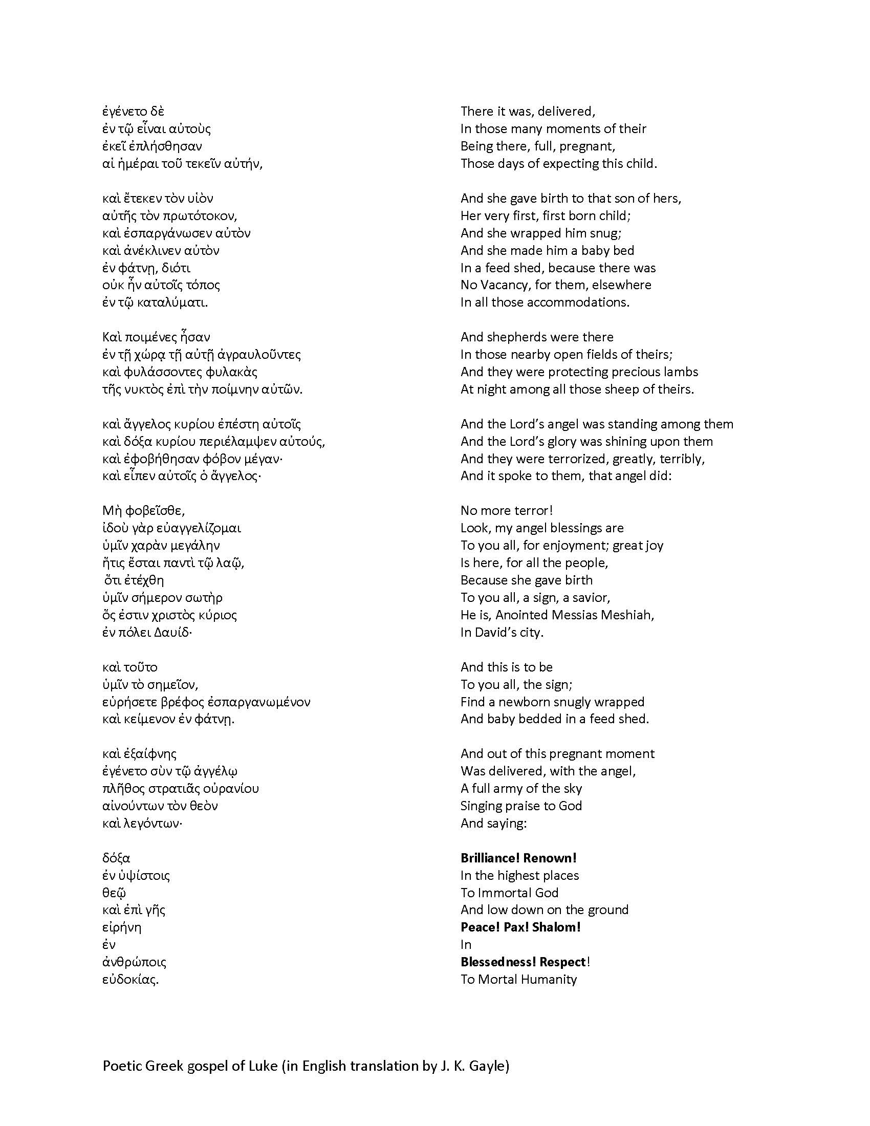 In the Greek gospel of Luke there’s intended or unintended wordplay that hearkens to the literatures of Hesiod’s Theo-GON-y, Aristotle’s GENE-eration of Animals, and the Septuagint’s GENE-sis. The language is poetic, rhetorical, political, historical. Above all it’s Generative, GYNakatic, Birth-Womb-Earth-ish, sometimes Male-on-top sexist, other times subversively feminist.