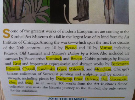Now, I guess you noticed that the one name I’ve highlighted for you is ambiguous: “Would that be, Marcel Duchamp?,” you ask. Well, yes, his works were there too.