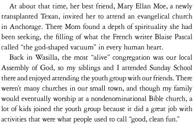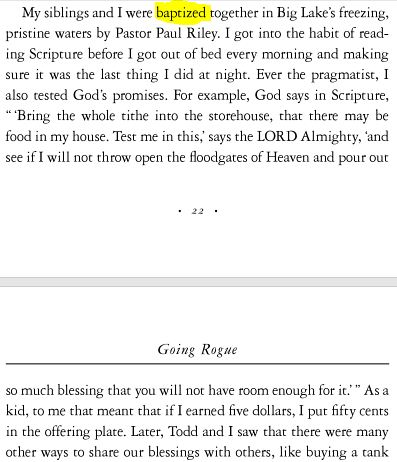 In her book, Going Rogue: An American Life, she describes her own baptism and those who influenced her along the way (i.e., her mother, whose best friend from Texas got the family going to church; Pascal; Sunday School & youth group; a pastor; and the Scriptures):