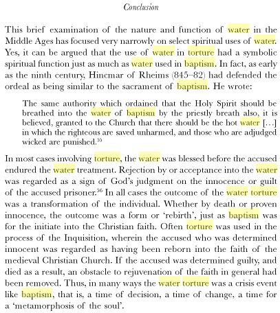 Historian Charles W. Connell, in his essay “From Spiritual Necessity To Instrument Of Torture: Water In The Middle Ages,” gives more than a glimpse into the connections between water torture and water baptism. (The report is in the book The Nature and Function of Water, Baths, Bathing and Hygiene from Antiquity through the Renaissance, edited by Historian Cynthia Kosso with Medievalist Anne Scott). Here is a history that continues as the present and the future of Sarah Palin:
