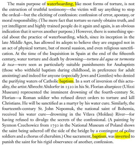 A decade ago, during the very public discussions and disputations about whether waterboarding is torture, the history of water torture was rehearsed rather thoroughly. There were not, if I recall correctly, many comparisons of waterboarding with baptism of the sort that Sarah Palin has made a few days ago.