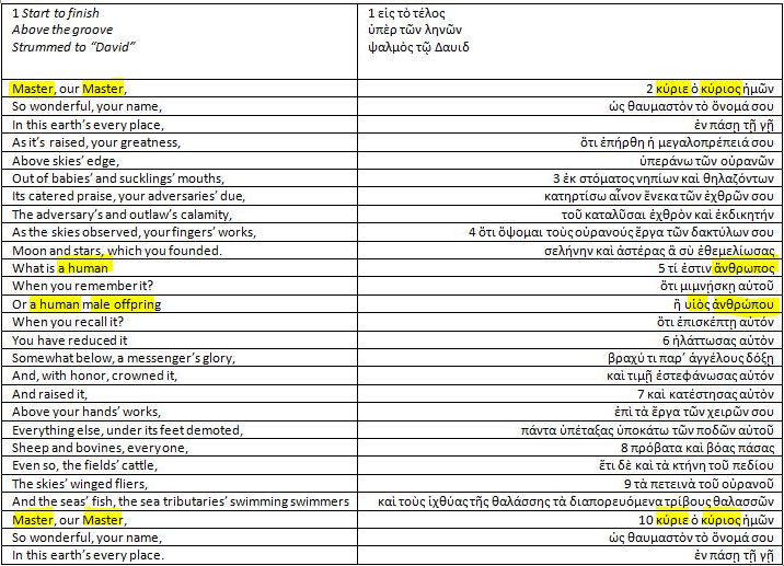 In one Psalm, what we refer to as Psalm 8, there’s the hierarchy of Master over all creation. It’s middle lines bring forth an anthropos (ἄνθρωπος) under heaven, out of earth, lower than an angel, above the animals of every species in every place. The LXX translator has Greek readers hearken back to the Hellene Genesis creation story again.