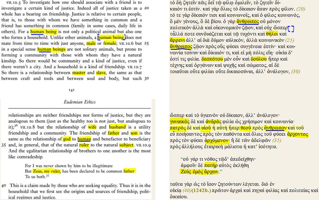 Below is Aristotle writing his Eudemian Ethics. Towards the end of the excerpt, he quotes a playwright, Sophocles (whom Aristotle disparages for his confused rhetoric elsewhere); those who would make unequal classes equal are like the playwright who would have Zeus not just a master ruler but some sort of fathering father of all offspring, of everybody, as if everybody is equal with everybody else. As I did above with my English and the LXX Greek of the Psalm, I’ve highlighted the concordant phrases, putting the English on one side and the Greek on the other. The following fine English translation is by Brad Inwood and Raphael Woolf. Very clearly these translators show Aristotle’s attempt to work classes and categories in binary “either / or” pairs, the one over the other. A close reading of the phrases shows what Mark, the gospel writer, might have been working with. At the very least, I hope readers of this post will see the gender inclusivity of Jesus in Mark. Now here’s Aristotle: