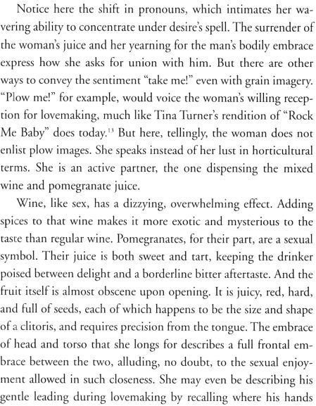 This sort of readerly expectation has come with texts much earlier, and especially when the subject matter has to do with bodies and love the images and allusions appear more forthcoming and rather obvious to the audience. For example, in reading the Song of Solomon 8:23, Carey Ellen Walsh in Exquisite Desire: Religion, the Erotic, and the Song of Songs has this:
