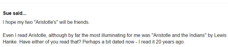 Her “two” she refers to in this comment are Theophrastus and me again (he writing in vigorous defense of Aristotle’s teachings and I in disdain of Aristotle’s misogyny); see how Suzanne gets us moving on, hoping for friendliness and for friendship in blogging, having us read something she’d already read as it is more clearly where we might share learning and come to some agreement.