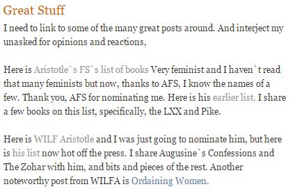 I take this two ways. First, I personally should keep on blogging. In spite of my single issue blogging, some people still want to read it. Second, I choose to read into the results that the biblioblogosphere wants to affirm the participation of women. I don’t think I am far off there.